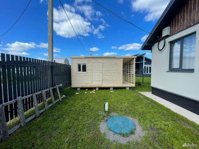 Дополнительные постройки: Отдельно стоящий летний домик с террасой (оборудован под санузел, душевую и постирочную) и домик для инвентаря.