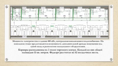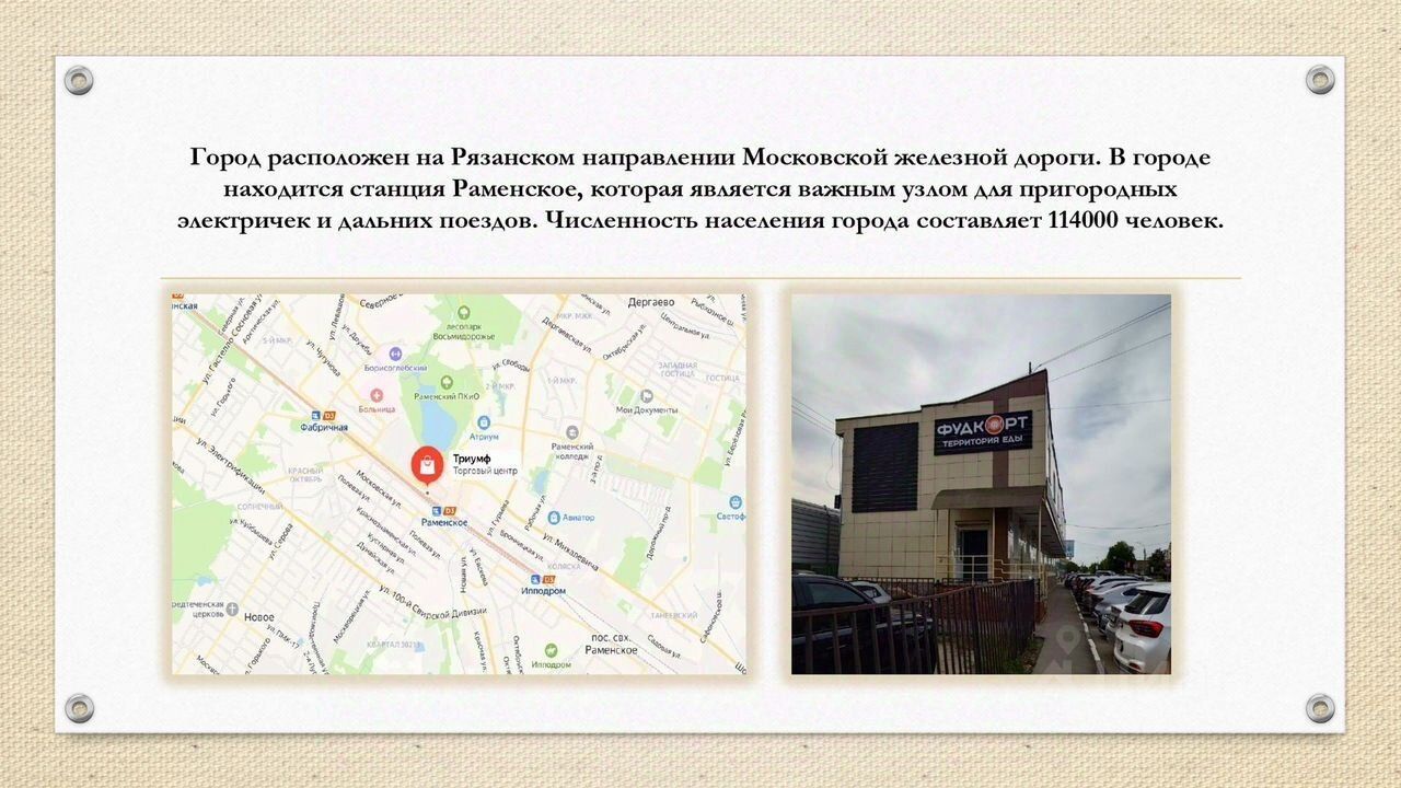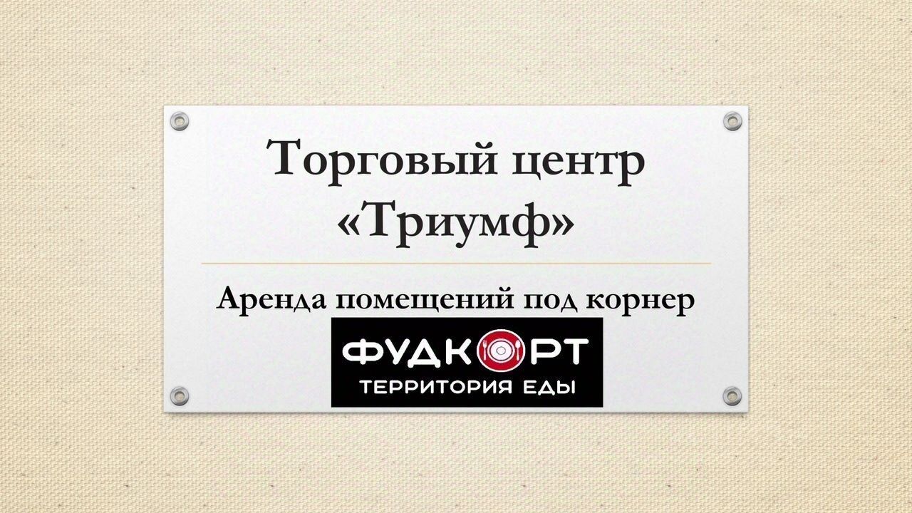 Это единственный Фудкорт в городе Раменское, расположен на 2м этаже ТЦ ТРИУМФ .Здание расположено в административно- деловом центре . Все центральные коммуникации. Всего 6 корнеров по 13 кв м с 82 посадочными местами.