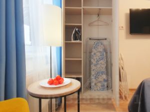 В студии стиральная машина и капсулы для стирки. Сушилка и гладильная доска в шкафу.
