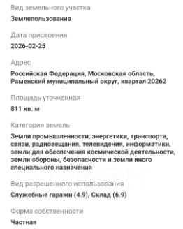 Категория земель: земли промышленности, энергетики, транспорта, связи, радиовещания, телевидения, информатики, земли для обеспечения космической деятельности, земли обороны, безопасности и земли иного специального назначения.