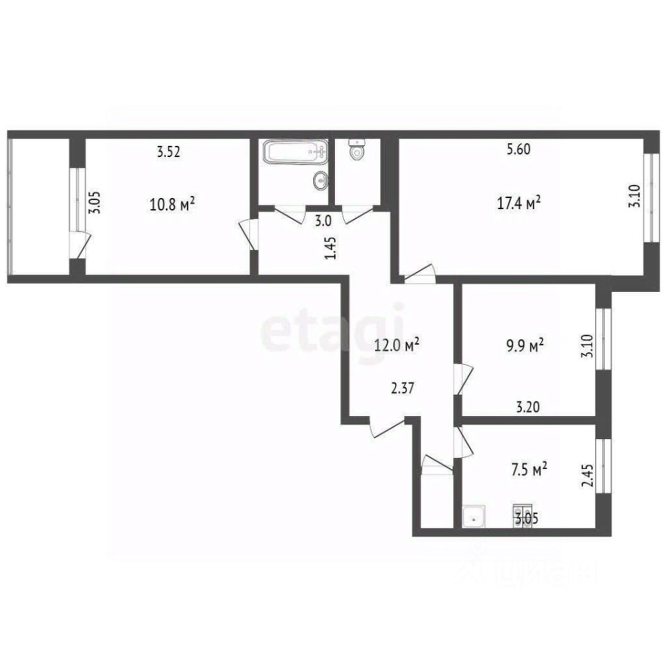 Общая площадь составляет 63.1 кв.м. Квартира функционально разделена на три изолированные комнаты, что обеспечивает комфортное проживание для семьи с детьми или возможность обустройства кабинета. Одна из комнат имеет выход на балкон.