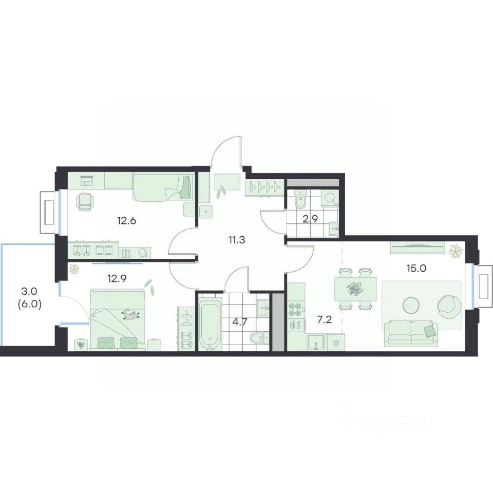 Общая площадь69,6 м²