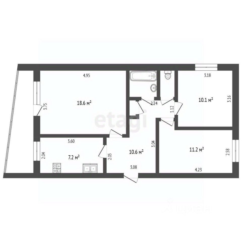 Общая площадь 61,9 кв.м. включает три изолированные комнаты 18.6, 11.2 и 10.1 кв.м., что обеспечивает комфорт для семьи. Планировка практичная: изолированные комнаты, санузел раздельный, большая застекленная лоджия с выходом из гостиной.