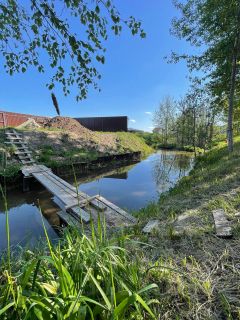 Участок правильной формы, сухой, не топит. По краю участка проходит небольшой ручей. Слева и справа соседями установлен забор.
