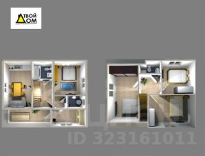 - 1-й этаж: открытая терасса, прихожая 10 м2, котельная 3 м2, холл 9 м2, кухня-гостинная - 16 м2, комната 14 м2, санузел 4 м2 (ванна, раковина, унитаз), выводы под посудомойку и стиральную машину